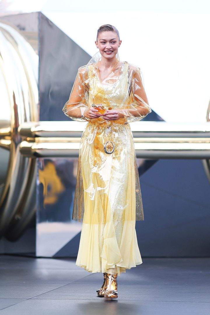 2025年3月、ファッションイベントでまとったのが、ラバンヌのバターイエローのドレス。繊細なスパンコールが煌めくドレスの上に、同色のシースルー・トレンチコートをレイヤードし、素材のコントラストで奥行きを演出。足元にはゴールドのブーツを合わせた、モダン&ゴージャスなドレスアップです。