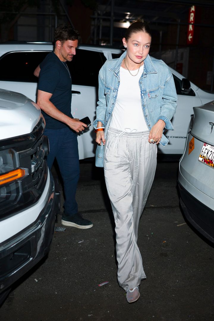 2025年6月、ブラッド・ピット&イネス・デ・ラモンとのディナー後にキャッチされたふたり。ジジは、リーバイスのデニムジャケットにメタリックなトラックパンツを合わせ、ブラッドリーは、ネイビーのワントーンでまとめたシンプルな装いで。寒色系でトーンを合わせた、気負わない大人の余裕を感じさせるスタイルです。
