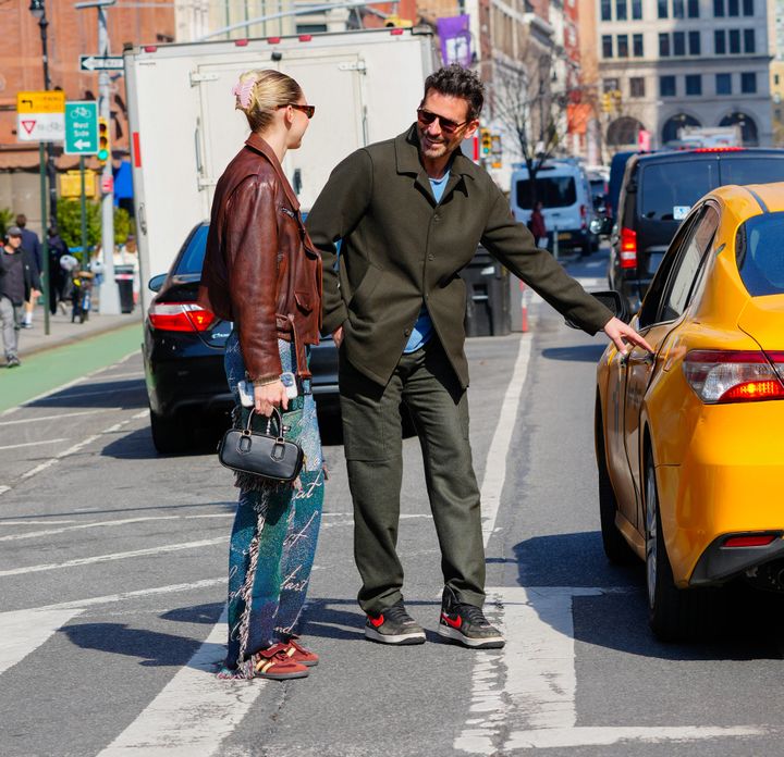 2024年2月、NYの街角でキャッチ。ジジはヴィンテージライクなブラウンのレザージャケットに、ブルーの総柄パンツを合わせた遊び心溢れる上級者スタイル。一方のブラッドリーは、オリーブグリーンのシャツジャケットを主役にしたシック&カジュアルなスタイル。彼女をさりげなくエスコートする姿に愛が滲む、都会派のカップルコーデです。