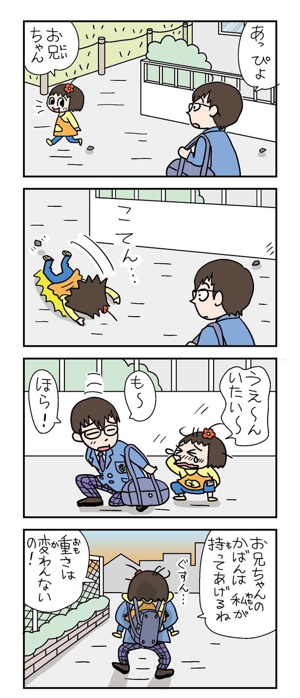 3. 【著者傑作選】「お兄ちゃんのかばんは私が持ってあげるね」転んだ妹をおんぶした兄。2人の絆にぐっとくる4コマ/ねぇ、ぴよちゃん④
