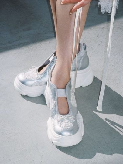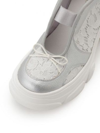バレエ業界を牽引するChacottとコラボレーションした厚底スニーカー。スニーカーとはいえ、形はガーリーなバレエシューズ風で甘さも見え隠れ。アッパーにはフラワーレースとフェイクレザーをあしらって、カジュアルすぎないよう調節しました。