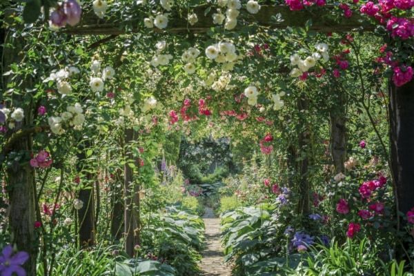 「ウェディングガーデン」や「コレクションガーデン」、「エバーガーデン」では、アーチに沿ってバラが立体的に植栽され、360度バラに囲まれる風景が広がります。