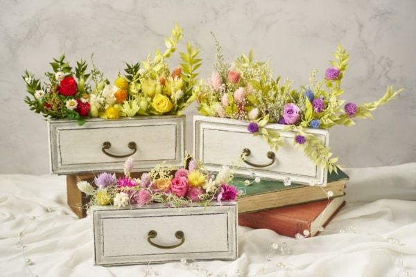名称:リトルローズチェスト 価格:5,000円 所要時間:50分〜60分 提供場所:gift & workshop「cokage」 詳細:小さなチェストに、バラやお花をアレンジして作るフラワー体験。引き出しからお花があふれるように咲く、可愛らしく華やかなアレンジメントで、部屋に飾るだけで空間を華やかに彩ります。