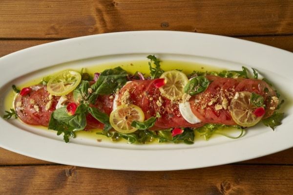 名称:薔薇・檸檬・トマトのインサラータ 価格:1,980円 提供場所:CODA ROSSA 詳細:塩やオイルでシンプルに味付けした野菜料理「インサラータ」。 薔薇の花びらとフレッシュトマト、熱海檸檬を合わせた爽やかな一皿です。