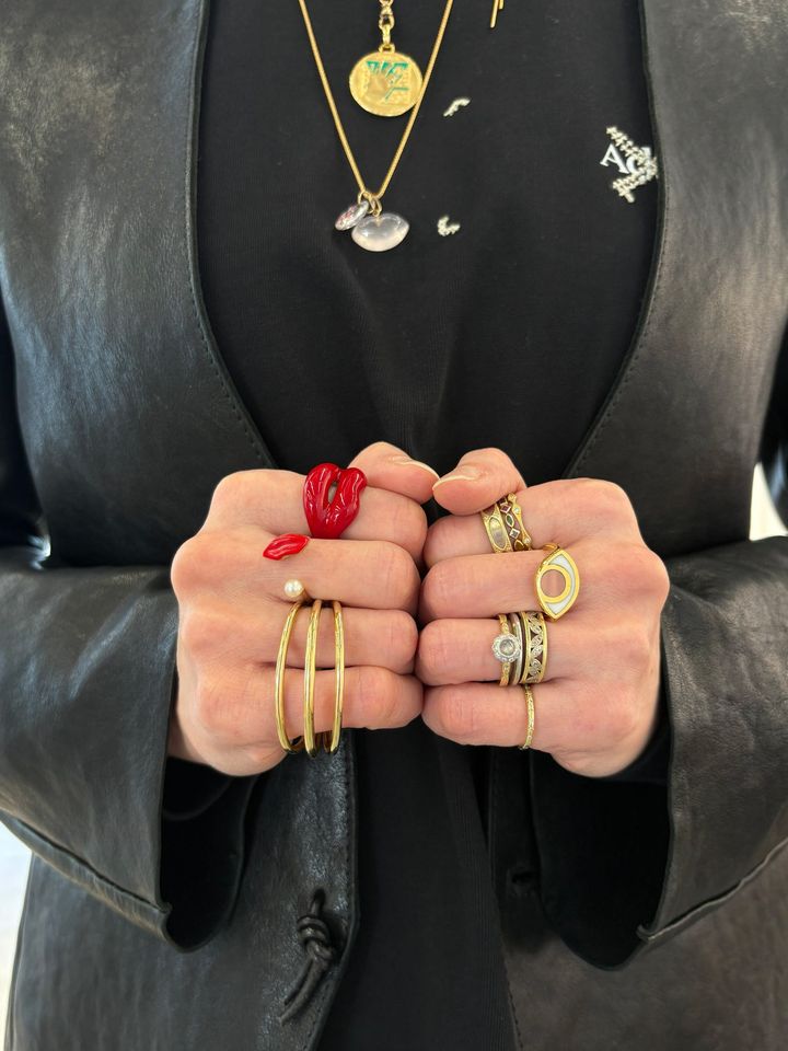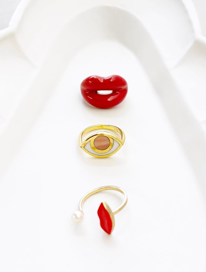 上から:ホットリップスバイソランジュのリング、マルタピアのリング、デルフィナ デレトレズのリング。 Hearst Owned