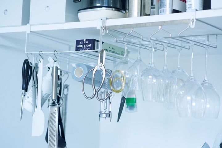 台所道具やグラスは吊るして収納。コンクリートブロックとステンレス仕様のオープンキッチンに立ち、部屋を眺めながら料理をするのが楽しいそうだ。