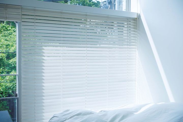 窓は天井まであるが、上下別々にブラインドが付けられているので、遮光の塩梅を操作しやすい。「ベッドにこぼれる光と、一期一会の影がきれいなんです」