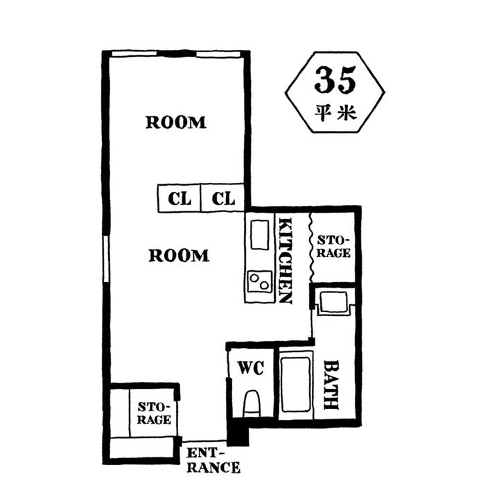 間仕切りを兼ねた、備え付けのクローゼットを挟んで、縦長のスペースを玄関に対して奥を寝室、玄関側をリビングダイニングとして使う。クローゼットは大容量だが、上部が天井に届かないので圧迫感はなく、むしろいいアクセントになっている。