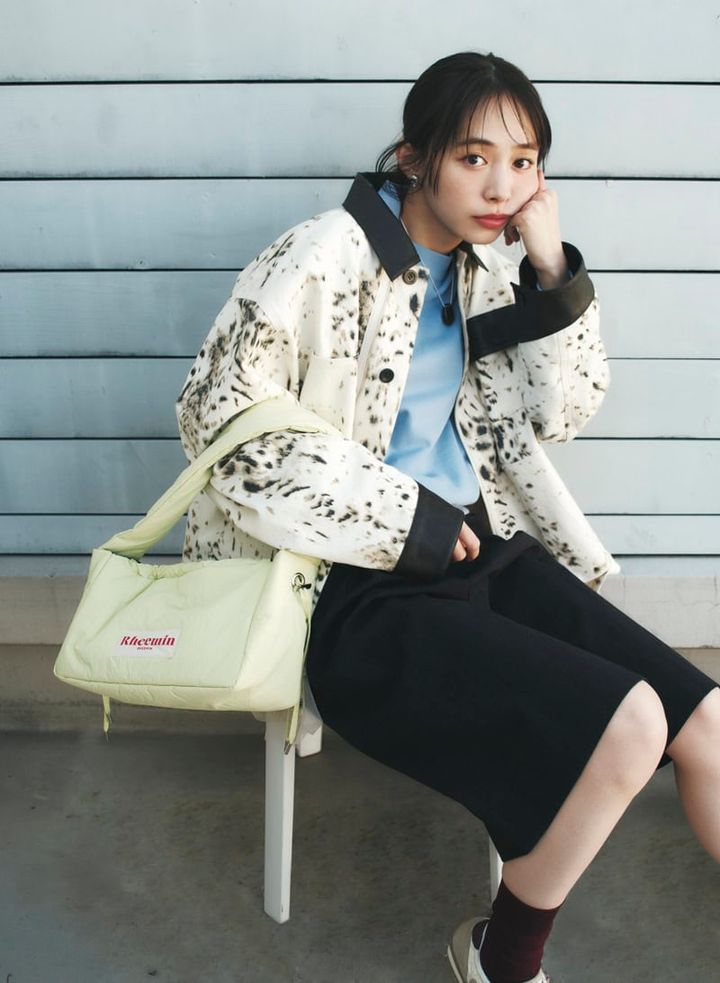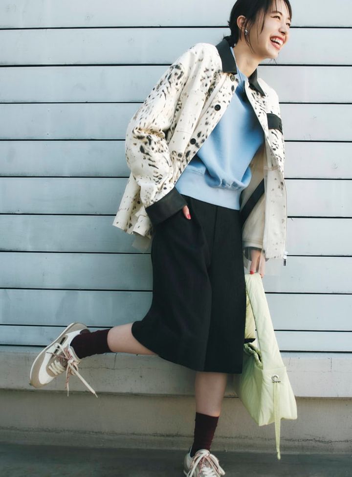 重心低めの今っぽいボトムバランスを構築。バミューダパンツ¥30,800、プルオーバー¥27,500(ともにロエフ/エイチ ビューティー&ユース) リバーシブルジャケット¥35,200(メゾンスペシャル/メゾンスペシャル 青山店) イヤリング¥2,860(アネモネ/サンポークリエイト) ネックレス¥55,000(リエ スタジオ/トゥモローランド) バッグ¥30,800(リーミン/ジャック・オブ・オール・トレーズ プレスルーム) ソックス¥1,650(タビオ) スニーカー¥31,900(デイト/ティースクエア プレスルーム)