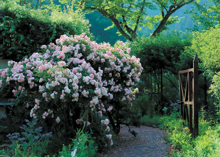 自生する木々や周りの山々を借景にした美しいガーデン。園内には約400種類、約1000株以上のバラが植栽されている。イングリッシュローズをメインにした「ローズガーデン」では、宿根草やハーブが色とりどりのバラをより一層引き立てる。春バラの見頃は5月中旬~6月上旬。