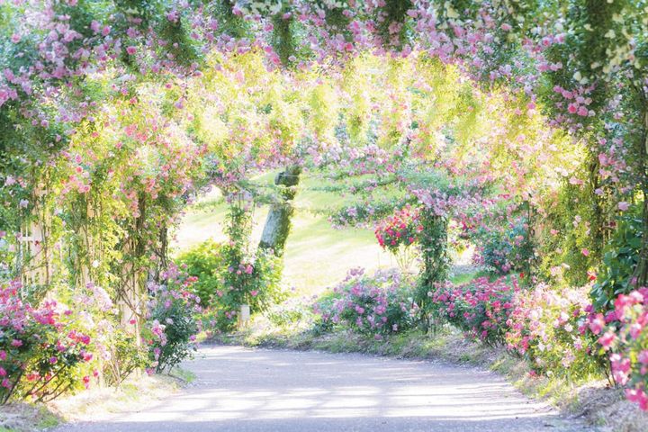 つるバラでできた全長220mのトンネルを見ることができるのは春だけ。その色彩とボリューム感は圧巻!