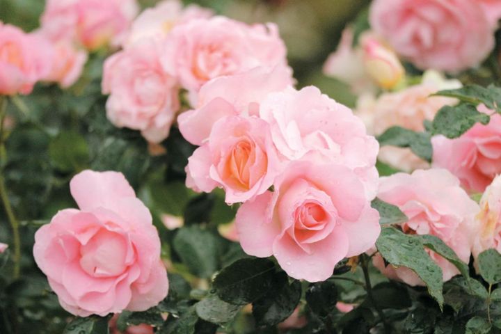 ソフトピンクにときおりアプリコットが混ざる、バランスのよい華やかな花姿。