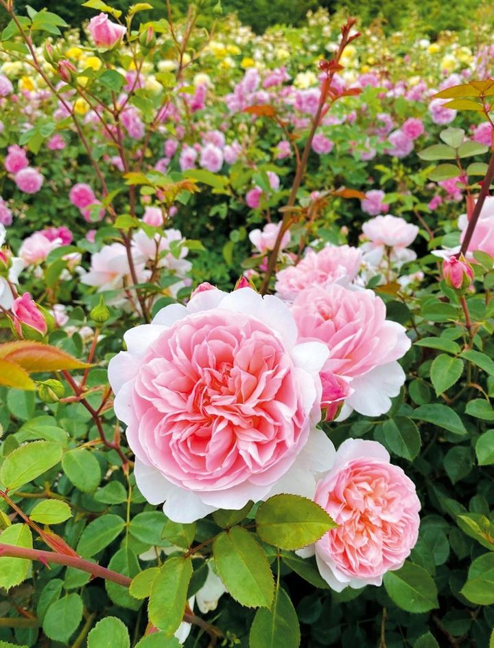 さまざまな品種のイングリッシュローズが楽しめるエリア。色や形、香りなど、品種ごとの違いをじかに感じることができる。