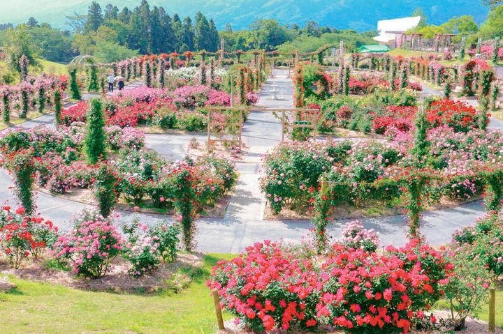 広大な敷地に約3万5000株ものバラが植栽された、日本最大規模を誇るバラ園。貴族や王族の名を冠したバラを集めた「ロイヤルガーデン」、さまざまな香りに包まれる「香りのガーデン」など、多彩なエリアでバラを堪能できる。春バラの見頃は4月下旬~5月下旬。