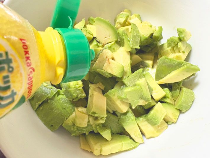この時、アボカドにライムの絞り汁を入れるのがメキシコ流の作り方ですが、筆者の近所にあるスーパーマーケットにはなかったので、レモン汁で代用してみます。
