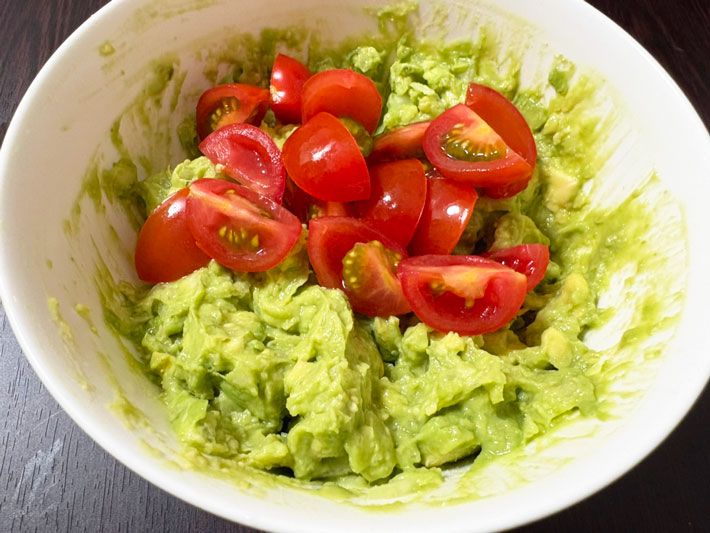 アボカドがドロドロになるまで潰したら、ミニトマトを入れて、軽く揉み合わせましょう。