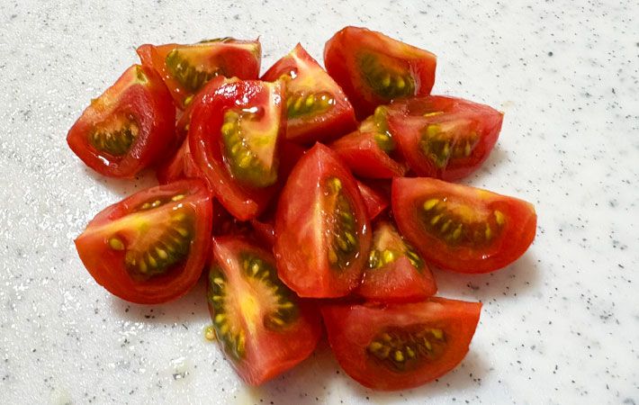 ミニトマトは、水洗いした後、ヘタを取って4等分にカットします。