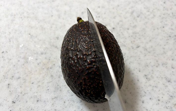 アボカドの皮は硬いですが、縦に切れ目を入れて包丁を1周させると、スーッとカットすることができますよ。