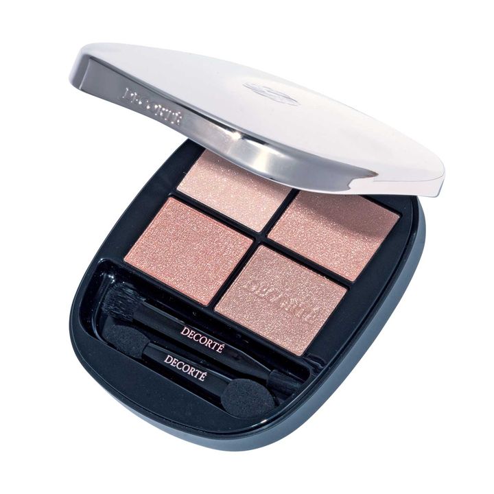 アイホールと下まぶた全体にDECORTÉの左下(ウォームベージュ)を広げ、右上(シアーベージュ)を目頭側半分に重ねる。左上(ライトベージュ)を目頭の下に入れてハイライトに。あえて目元に締め色を入れず、ツヤを活かしてスッキリと明るい印象に。SUQQUのチークを頰の中央に横長に広げ、上からハイライトを重ねて多幸感を。SENSAIのリップを全体に塗る。リップはくすまない色選びが大切。