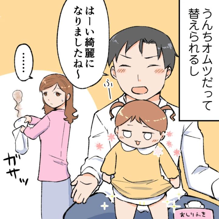 さくらのうんちオムツだって替えられます。いつも通りおしりふきで優しく拭いて、汚れたオムツはゆきのにパス。はい、これで綺麗になった。こんな簡単なことができないパパが世の中にいるなんて、正直信じられませんよ。