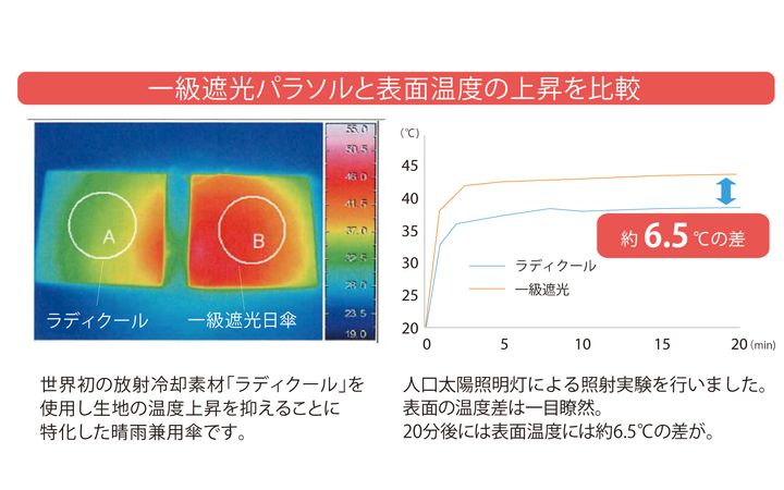 人工太陽照明を使った実験では、通常の一級遮光パラソルと比べて20分後に約6.5度もの表面温度差が出る結果に。炎天下でも快適さが持続します。
