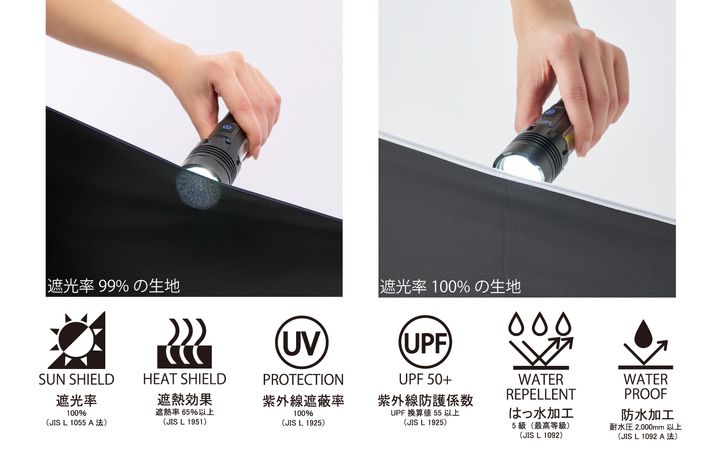 ② 遮光・UVカット率100%、遮熱評価S65+のハイスペック