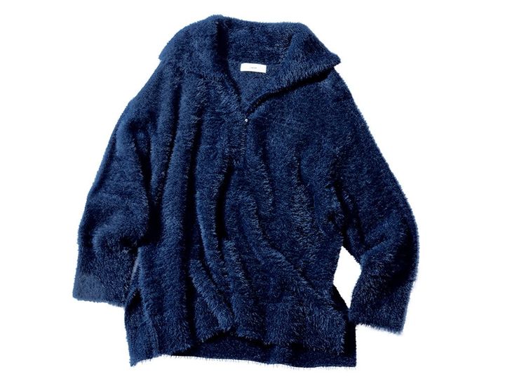 スキッパーのカジュアル感が、きちんと見えネイビーの抜け感に一役。トップスのフェザーが華やかなスカートと共鳴しワンツー以上の完成度に。
