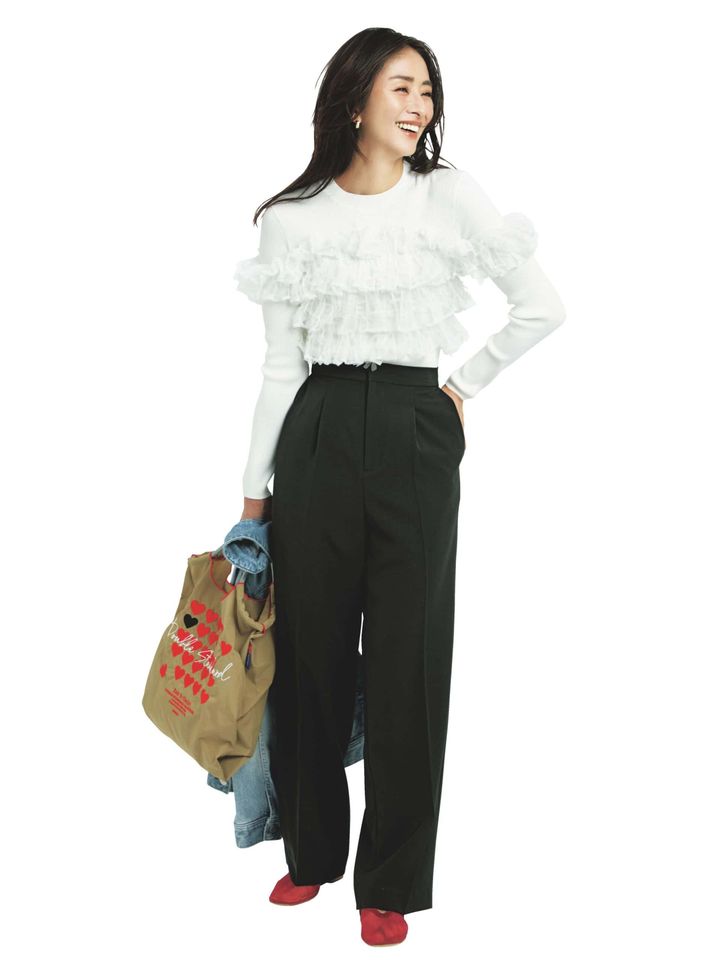 パンツ¥15,950(DAY by DAY It’s international)ニット¥16,500(マイストラーダ/マイストラーダ プレスルーム)ジャケット¥26,400(アルページュストーリー/アルページュストーリー プレスルーム)バッグ¥6,050(ボールアンドチェーン×ダブルスタンダードクロージング/フィルム)シューズ¥42,900(ヒューン/クルーズ ショールーム)ピアス¥110,000(ウノアエレ/ウノアエレ ジャパン)