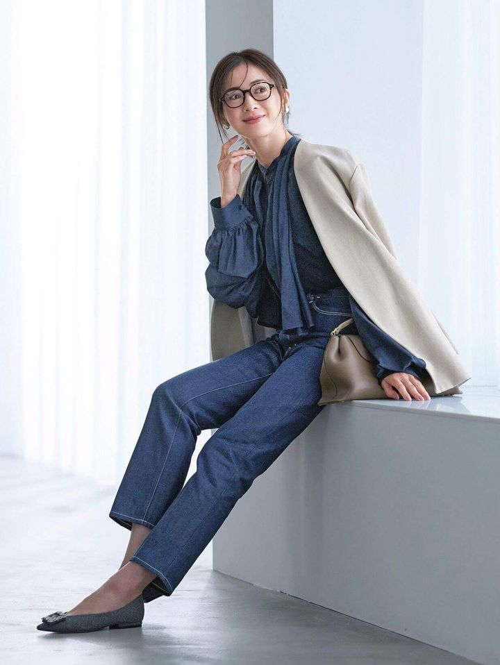 デニムパンツ¥33,000(ロエフ/エイチ ビューティー&ユース)ブラウス¥25,960(イウエン マトフ/ユナイテッドアローズ 渋谷スクランブルスクエア店)ジャケット¥47,300(フィーニー)バッグ¥52,800(TOV/アンソロジー)パンプス¥46,200(ピッピシック/ベイジュ)メガネ¥54,780(オリバーピープルズ/ルックスオティカジャパン カスタマーサービス)イヤリング¥11,000(アビステ)