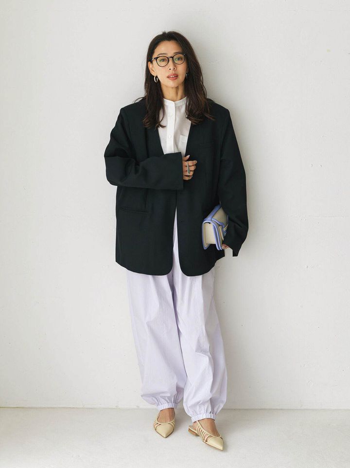 チュール付きジャケット¥46,200(プランクプロジェクト/プランクプロジェクト 青山店)シャツ¥27,500(HER.)パンツ¥25,960(イウエン マトフ/ユナイテッドアローズ 渋谷スクランブルスクエア店)バッグ¥157,300(ピエール アルディ/ピエール アルディ 東京)パンプス¥70,400(ネブローニ)メガネ39,600(プロポ/プロポデザイン)ピアス¥29,700(バルブス/ズットホリック)リング[左手]¥3,300(ヘンカ)リング[右手]¥38,500(リューク)