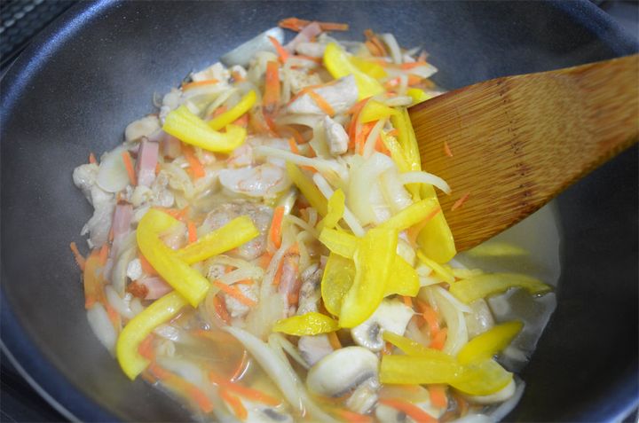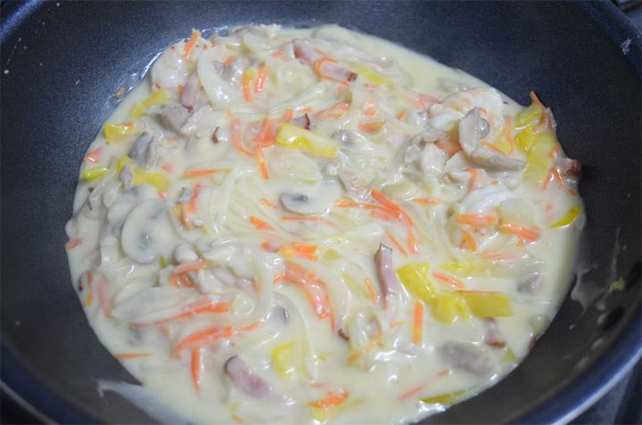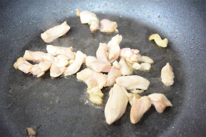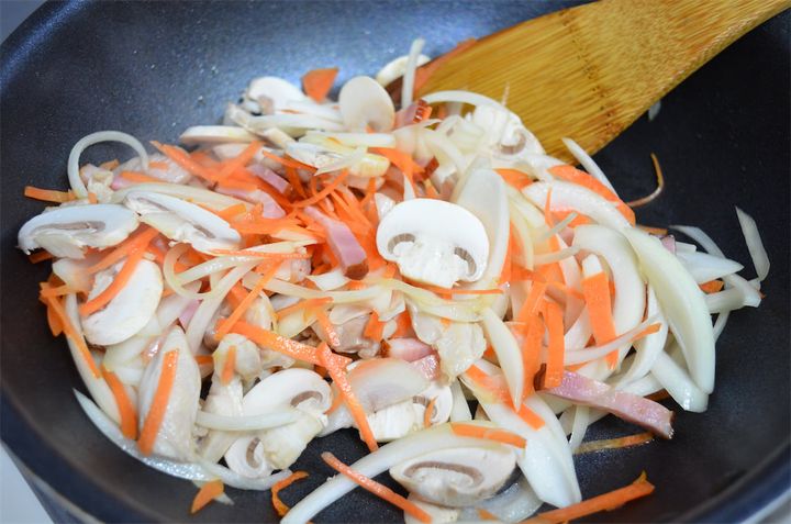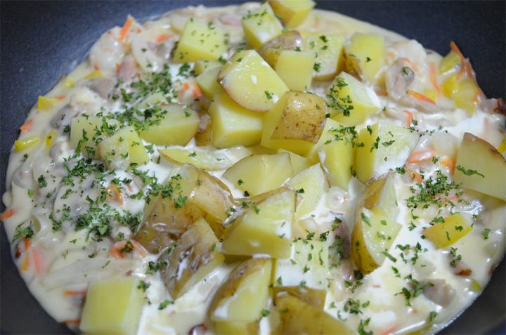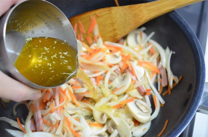 5. 油で2のにんじん、玉ねぎ、ベーコン、鶏肉、マッシュルームを炒め、チキンスープを入れて煮る。