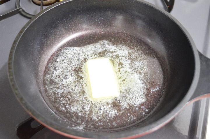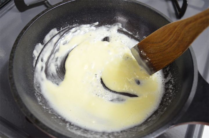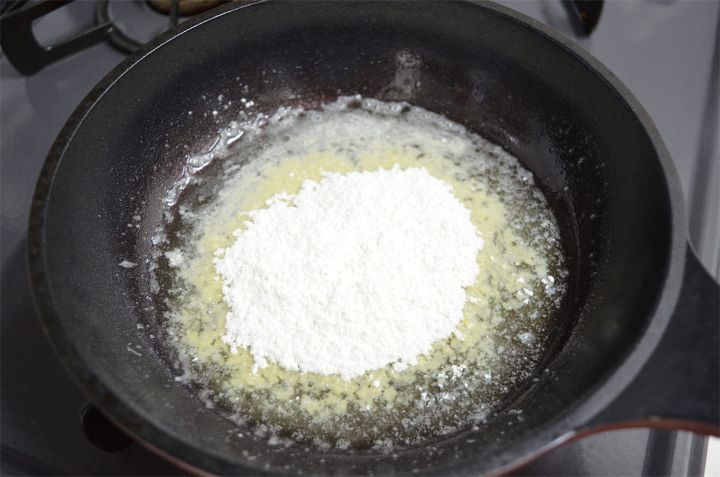 4. [ホワイトソース]を作る。熱したフライパンにバターを入れ溶かす。弱火で小麦粉を炒めたら、牛乳を加えて伸ばす。