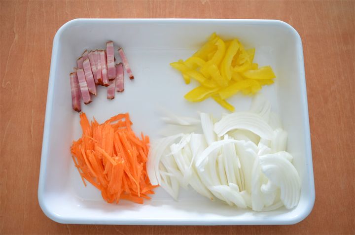 2. にんじん、玉ねぎ、ベーコン、パプリカは細切りにする。