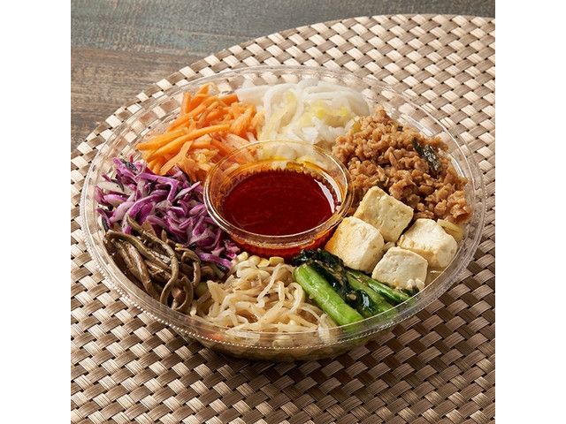 具は、大根たくあん甘酢和え・高菜そぼろ・ぜんまい・豆腐・ナムル4品目(小松菜・もやし・紫キャベツ&ひじき・人参)計8品目 食感や味にアクセントになる甘酢和えや、ナムルを合わせたビビン麺です。 ※東京都(港区、渋谷区、新宿区、千代田区、中央区、品川区、文京区、豊島区、目黒区) 、神奈川県(横浜市西区、中区、神奈川区、川崎市川崎区)での取り扱いです。 東京都の一部、神奈川県の一部で販売