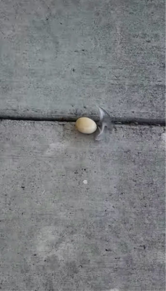 歩道に卵が落ちているのを見つけた撮影者さん。 撮影者さんは、周囲に落としたヒトがいないかと周囲を確認します!!