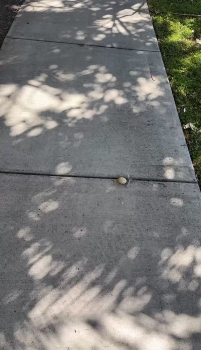 目の前に、何かが落ちていることに気付いた撮影者さん。 白っぽくて楕円形の物体、そう卵がおちていたのです!