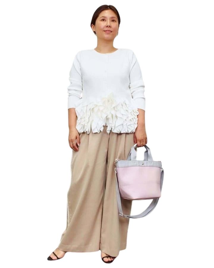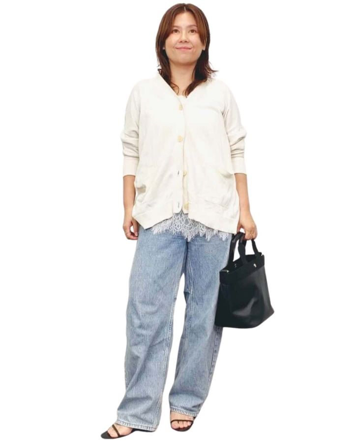 カーディガンは寒暖差のある今の時季ににちょうどいい。白×ベージュの柔らかい配色で春らしく。
