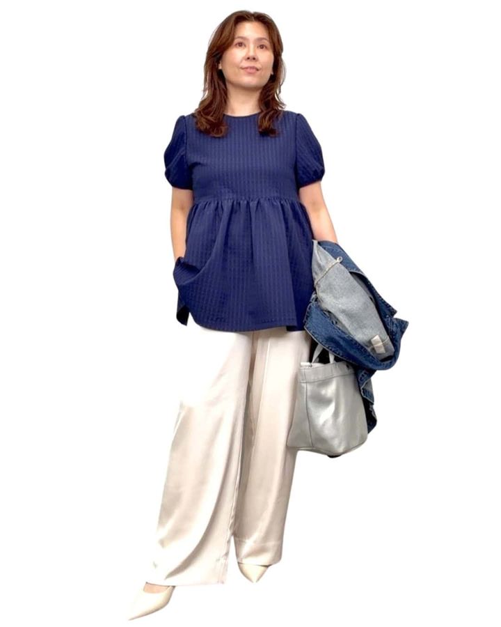 チェックのような凹凸感のある素材で、サラッとして肌離れよく涼しく着られるパフスリーブトップスは、夏も快適に過ごせる軽やかな着心地です。白のサテンパンツを合わせれば、ほどよい艶で上品に。デニムジャケットを羽織れば、ネイビーでまとめた大人カジュアルに◎。