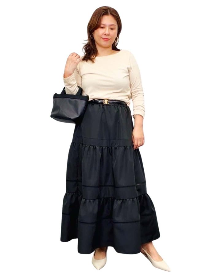 立体感のあるティアードデザインで、動くたびに表情の生まれるスカート。ふんわり広がるシルエットが女性らしさを引き立て、ウエスト周りはすっきり見え。ゴム仕様も嬉しい。