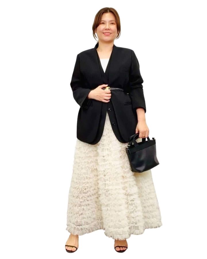 ボリュームはありつつも軽やかなチュールと膝下の透けが抜け感をプラス。重く見えず動きにニュアンスが出る主役スカート。ジャケット合わせでオンスタイルをワンランクアップ。