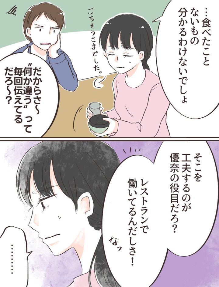 「・・食べたことないもの、分かるわけないでしょ」これまで義母の手料理を食べたことのない私に突然「橋本家の味を覚えて欲しい」と言う夫にそう言うと、「だからさ~『なんか違う』って毎回伝えてるだろ~?そこを工夫するのが優菜の役目だろ?レストランで働いてるんだしさ!なっ」と詳しく説明するつもりは全くないようでした。