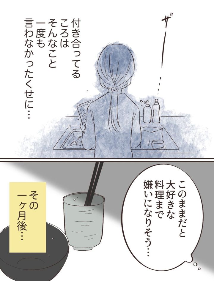 その後、洗い物をしながら「付き合ってる頃はそんなこと一度も言わなかったくせに・・」と呟く私。「このままだと料理まで嫌いになりそう・・」そんな思いまで浮かんできてしまいました。