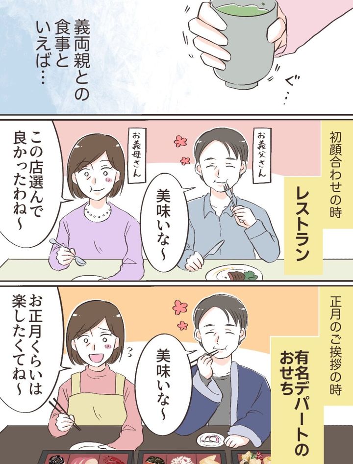 初顔合わせにはレストランで、「美味いな~」「この店選んでよかったわね~」と言いながら義両親が美味しそうに食事をする姿や、正月のご挨拶の時には、有名デパートのおせちを食べながら「美味いな~」満足そうな義父の隣で「お正月くらいは楽したくてね~」と言う義母の姿。