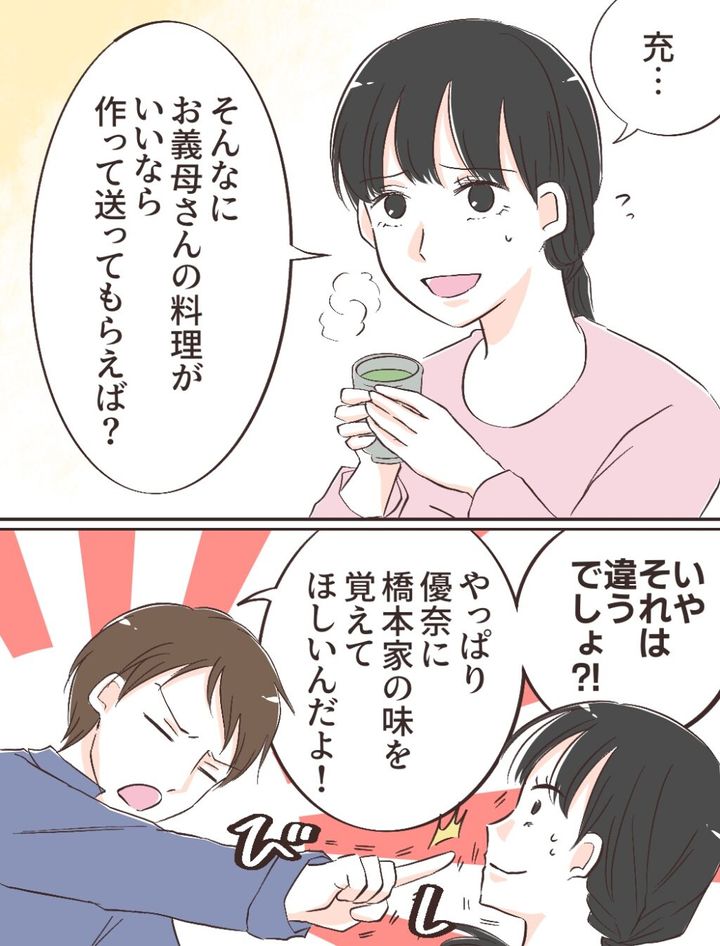 「充・・そんなにお義母さんの料理がいいなら作って送ってもらえば?」私がそう言うと、「いやそれは違うでしょ!?やっぱり優菜に橋本家の味を覚えてほしいんだよ!」とキッパリ言われてしまいました。