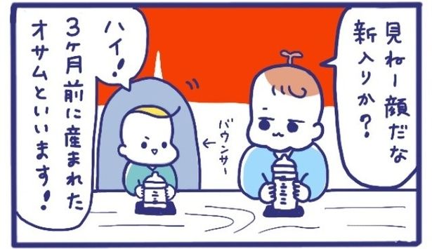 この日は「屋台ヤケミルク」に生後3カ月の新入り、オサムがやってきた。ゲップがまだひとりでできないため、“先輩”赤ちゃんであるのんちゃんが背中をトントンしてあげるのだ。