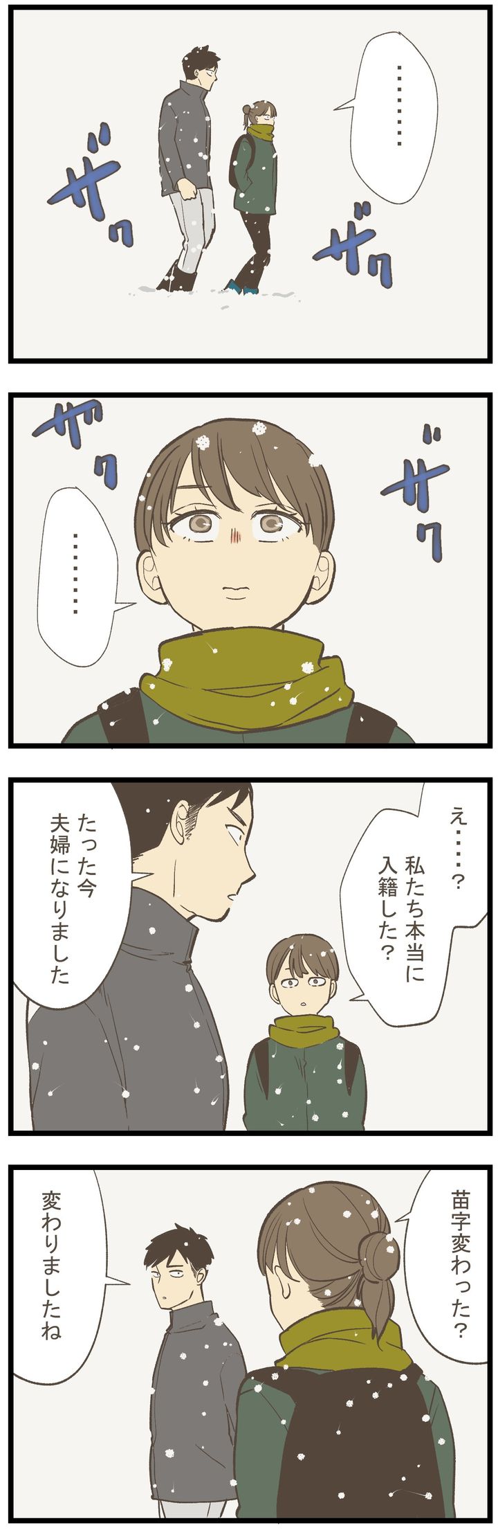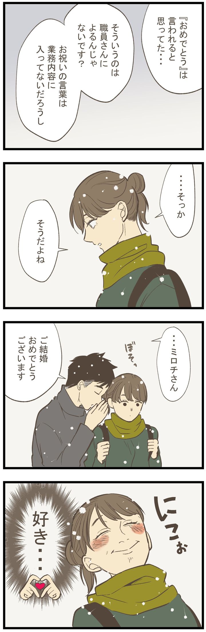 「受理しますね」とひと言だけで終わって、あまりのあっけなさに「本当に入籍した?」「苗字変わった?」と疑うミロチさん。「たった今夫婦になりました」と言うチロくんに、ミロチさんは「おめでとうは言われると思ってた」とどこか寂しそう。