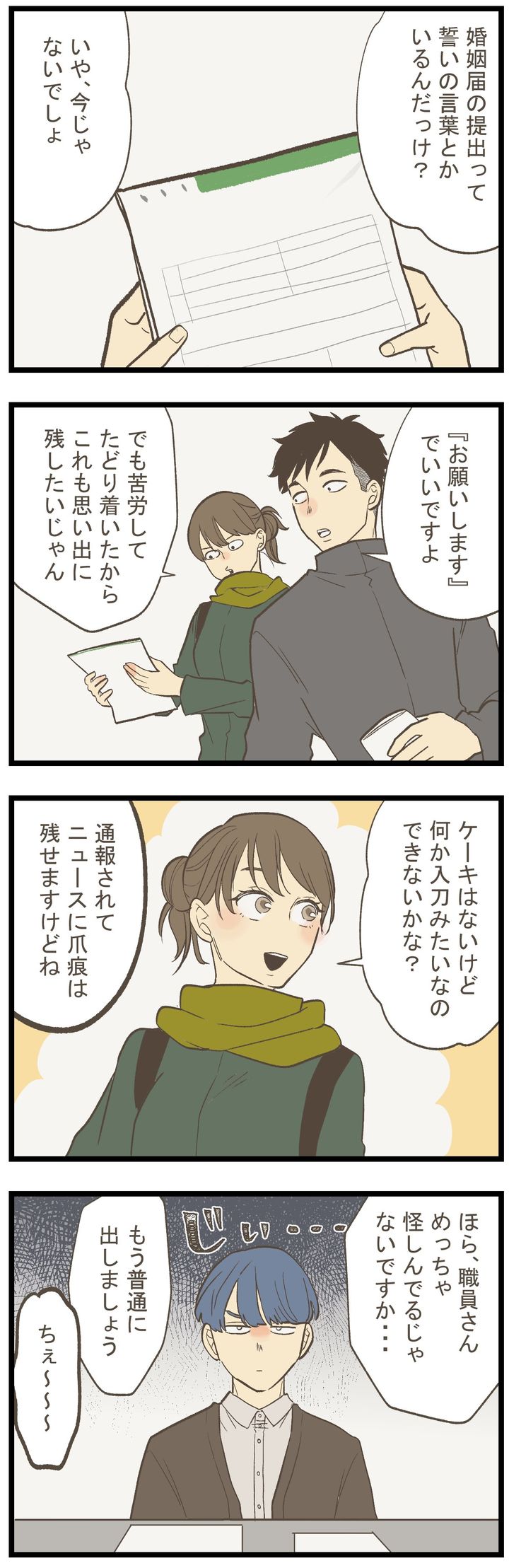 婚姻届の提出にやってきたミロチさんとチロくん。提出をなんとか思い出に残したいと画策するミロチさんですが、受付前であれこれやりとりするふたりを職員は怪しんだ目で見つめていて…。結局、普通に「お願いします」と提出することに。