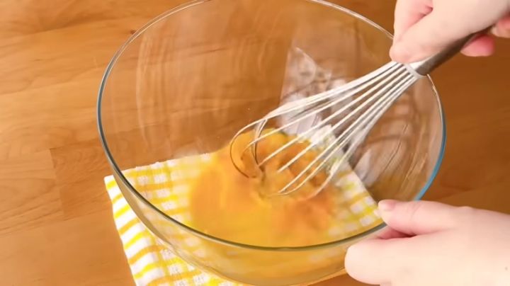 卵を割り入れたら、泡だて器でかき混ぜていきます。