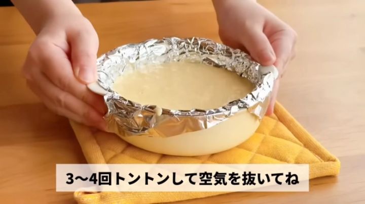 3回~4回トントンと器ごと軽く落として空気を抜きましょう。
