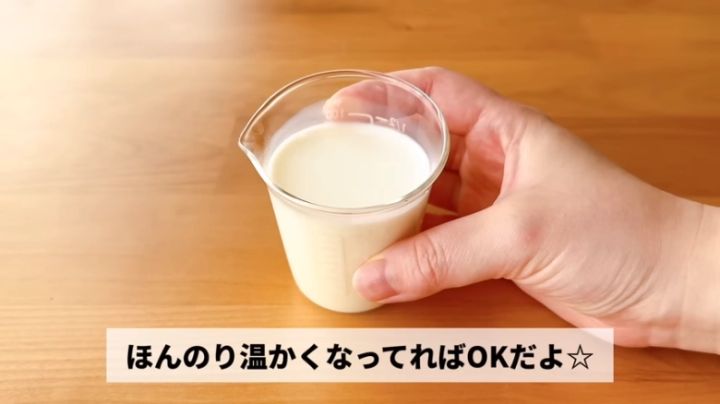 牛乳は直前にレンジで温めておきます。500Wの電子レンジで30秒~40秒でOK。